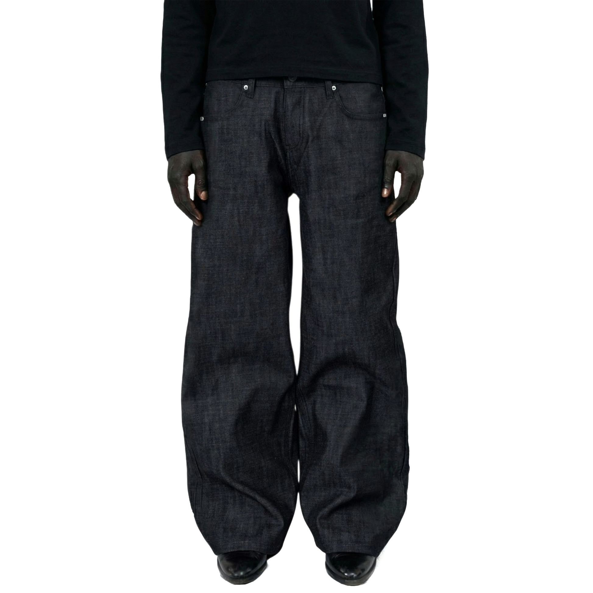 THESE EXCLUSIVE LOOSE-FIT 14 OZ. RAW JAPANESE SELVEDGE DENIM JEANS ARE REFINED WITH TIME, PRECISION, AND INTENTION. THE SILHOUETTE CARRIES A BOLD, DETAILED, AND IMPOSSIBLE TO OVERLOOK. BLACKED-OUT DETAILS, WEIGHTED METAL HARDWARE, AND A RED-LINE SELVEDGE ID. A PIECE MADE TO STAND OUT, NOT TO BE REPEATED.